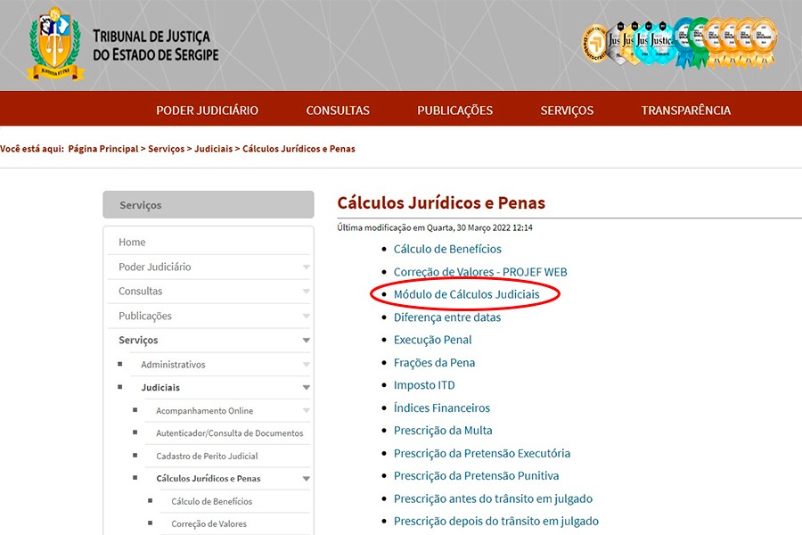 O Tribunal de Justiça de Sergipe (TJSE) disponibiliza, neste link https://www.tjse.jus.br/portal/servicos/judiciais/calculos-juridicos-e-penas, acesso ao novo sistema de cálculos utilizado pela Divisão de Perícias Contábeis, intitulado de ‘Módulo de Cálculos Judiciais’. A ferramenta está disponibilizada gratuitamente para qualquer usuário, mediante prévio cadastro no próprio sistema.