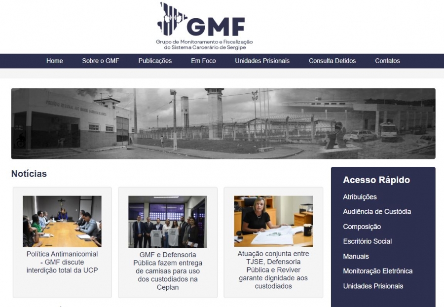 Entrou no ar nesta sexta-feira, 24 de maio, o portal do Grupo de Monitoramento e Fiscalização do Sistema Carcerário do Estado de Sergipe (GMF/SE). Na página, disponível na seção de portais do site do Tribunal de Justiça de Sergipe (TJSE), o usuário tem acesso rápido a notícias, informações, orientações e manuais relacionados ao GMF/SE, como atribuições, audiências de custódia, composição, Escritório Social, Monitoração Eletrônica e Unidades Prisionais.