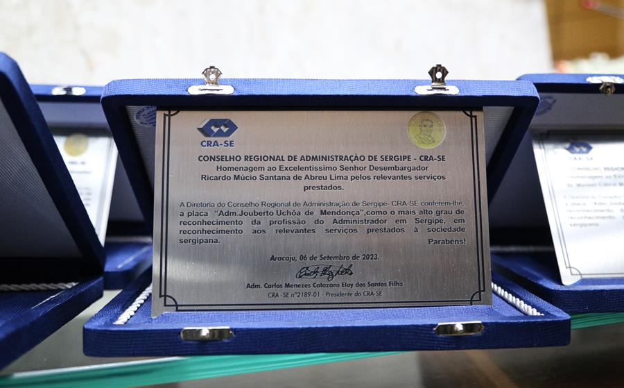O presidente do Tribunal de Justiça de Sergipe (TJSE), desembargador Ricardo Múcio Santana de Abreu Lima, recebeu nesta sexta-feira, 6 de setembro, do Conselho Regional de Administração de Sergipe (CRA-SE) a placa “Adm. Jouberto Uchôa de Mendonça”, mais alto grau de reconhecimento da profissão do Administrador em Sergipe. A homenagem feita em sessão especial na Assembleia Legislativa de Sergipe (Alese) fez parte das comemorações dos 59 anos do Dia do Administrador, comemorado no dia 9 de setembro.