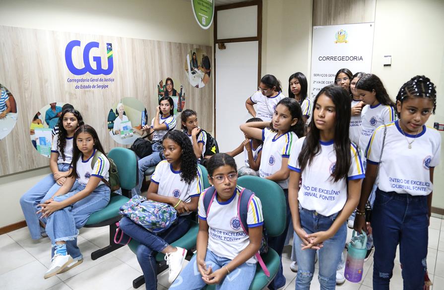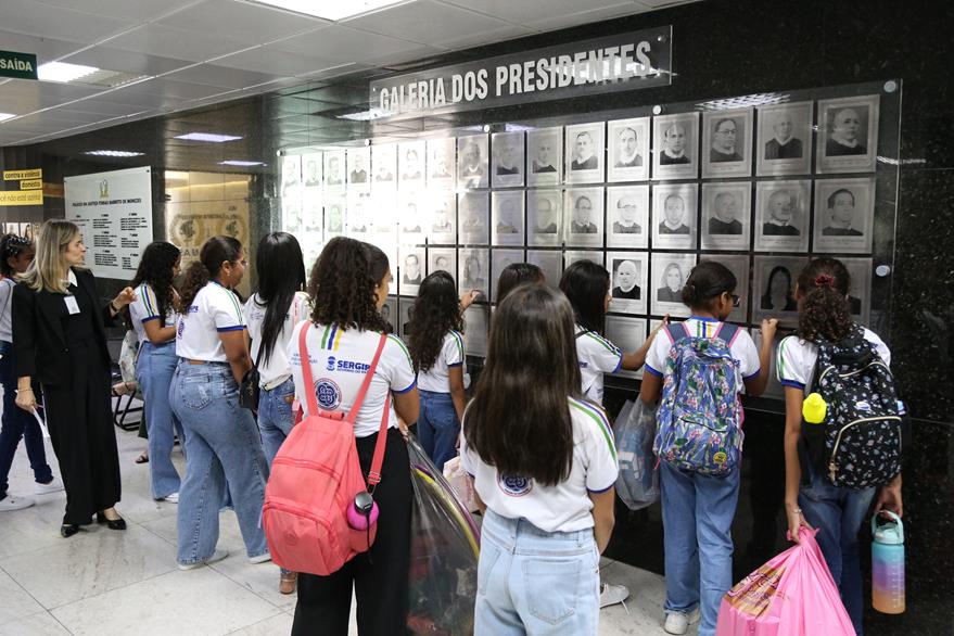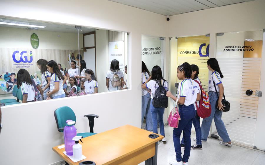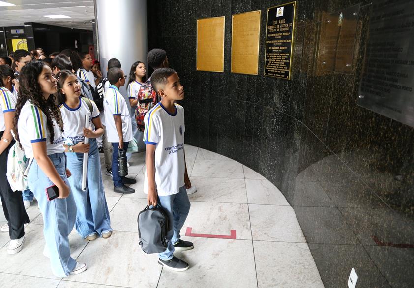 A visita começou pelo Palácio da Justiça, guiada pelo Cerimonial do TJSE e servidores da CIJ, passando pelo auditório onde são realizadas as solenidades, Tribunal Pleno, Corregedoria-Geral da Justiça, Coordenadoria da Mulher e CIJ. Os alunos ganharam exemplares da Coleção ‘Em miúdos’, publicação do Senado Federal que trata de forma lúdica temas ligados à cidadania e direitos.