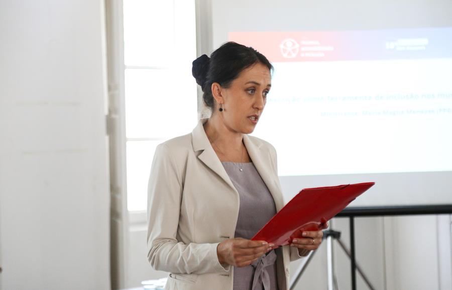A temática foi abordada, nesta quinta-feira, dia 26/09, pela historiadora e mestranda em Ciência da Informação, Maria Magna Menezes. Ela destacou a importância da audiodescrição como uma ferramenta de inclusão e acesso às pessoas com deficiência aos acervos dos museus.