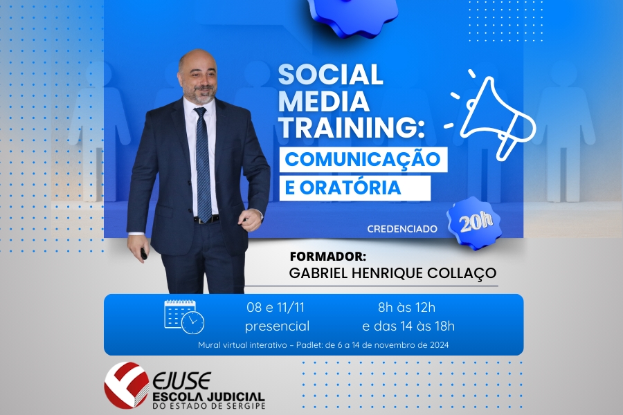 A Escola Judicial de Sergipe (Ejuse) abre inscrições para o curso ‘Social Media Training: comunicação e oratória’. A capacitação é direcionada para magistrados e magistradas do Tribunal de Justiça de Sergipe (TJSE) e será ministrada pelo jornalista Gabriel Henrique Collaço. As inscrições podem ser realizadas até o dia 6/11 por meio do Portal Ejuseweb.