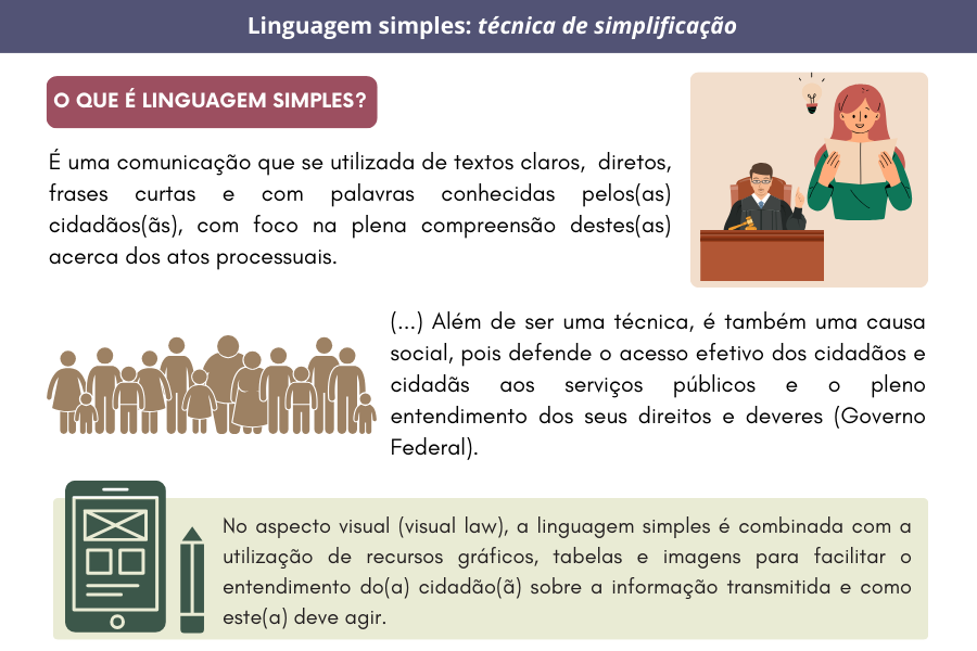 Além de ser uma técnica, a Linguagem Simples é também uma causa social, pois defende o acesso efetivo dos cidadãos e cidadãs aos serviços públicos e o pleno entendimento dos seus direitos e deveres. No aspecto visual (visual law), a linguagem simples é combinada com a utilização de recursos gráficos, tabelas e imagens para facilitar o entendimento do(a) cidadão(ã) sobre a informação transmitida e como este(a) deve agir.