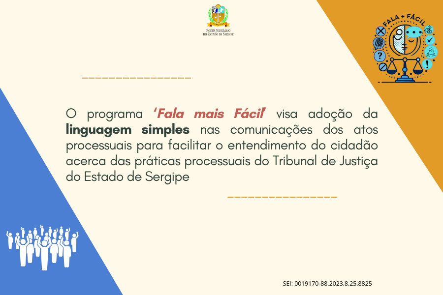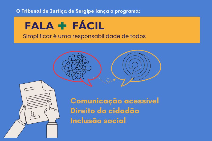Para a adoção da linguagem simples nas comunicações dos atos processuais e facilitar o entendimento do cidadão acerca das práticas processuais, o Tribunal de Justiça de Sergipe (TJSE) lança o programa “Fala + Fácil”. O programa está entre as ações do Pacto Nacional do Judiciário pela Linguagem Simples do Conselho Nacional de Justiça (CNJ), que visa uma comunicação com textos claros, diretos, frases curtas e com palavras conhecidas pelos(as) cidadãos(ãs), com foco na plena compreensão destes(as) sobre os atos processuais.