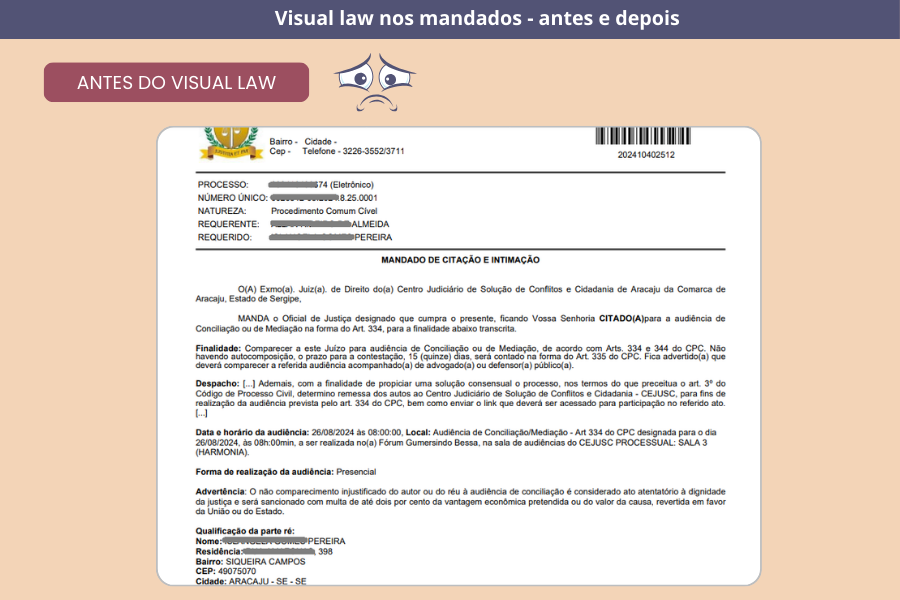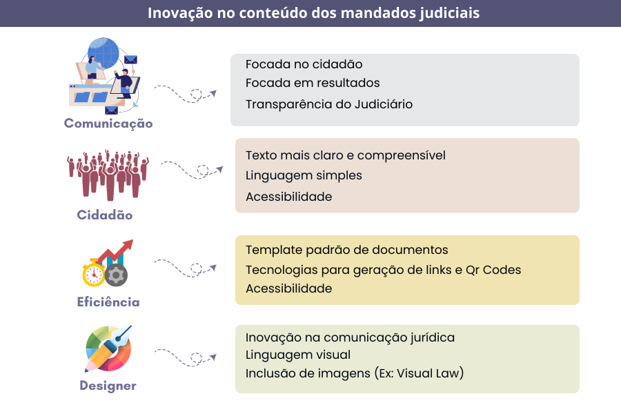 No quesito inovação do conteúdo dos mandados judiciais, o Fala + Fácil traz uma comunicação focada no cidadão, em resultados e em maior transparência do Judiciário. Ao jurisdicionado, um texto mais claro e compreensível, gerando mais acessibilidade. Um template padrão de documentos com tecnologias para geração de link e Qr Codes, com um design inovador na comunicação jurídica, linguagem visual para facilitar o entendimento e a inclusão de imagens por meio do Visual Law.