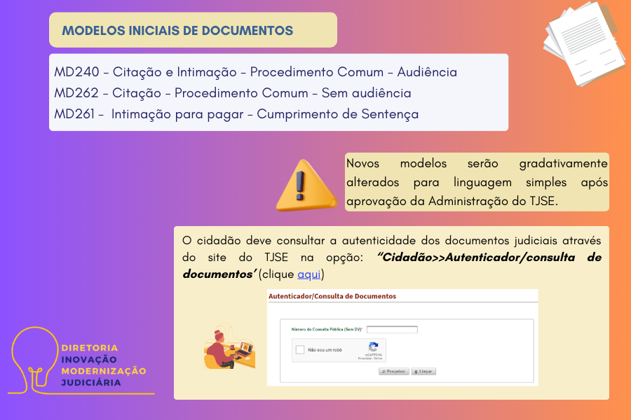 Estarão disponíveis já na próxima segunda-feira, 11 de novembro, os novos modelos iniciais de documentos: MD240-Mandado de Citação e Intimação para audiência; MD261-Mandado de Intimação para cumprimento de Sentença e MD262-Mandado de Citação sem audiência. Outros modelos serão gradativamente alterados para linguagem simples e disponibilizados. O cidadão deve consultar a autenticidade dos documentos judiciais através do site do TJSE na opção: “Cidadão>>Autenticador/consulta de documentos”.