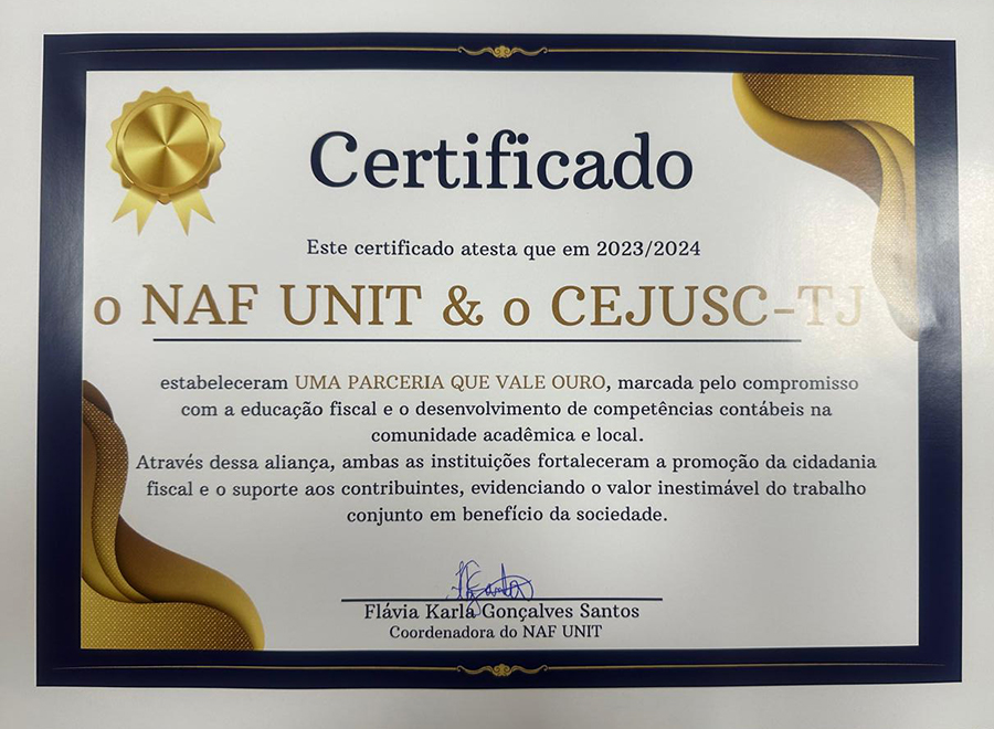 O Centro Judiciário de Solução de Conflitos e Cidadania (Cejusc) do Tribunal de Justiça de Sergipe (TJSE) recebeu nesta quinta-feira, 14 de novembro, o certificado “Uma parceria que vale ouro”, oferecido pelo Núcleo de Apoio Contábil e Fiscal (NAF) da Universidade Tiradentes (Unit).