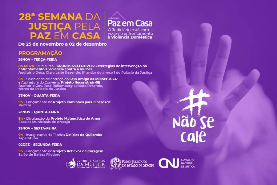 A 28ª edição da Semana Justiça pela Paz em Casa acontecerá de 25 de novembro a 2 de dezembro. Em Sergipe, a programação é organizada pela Coordenadoria da Mulher do Tribunal de Justiça de Sergipe (TJSE) e contará com realização de feirinha de empreendedorismo, inauguração de fábrica de chocolate, palestras, cursos, entrega do Selo Amigo da Mulher, projeto Matemática do Amor em escola municipal, entre outras ações.