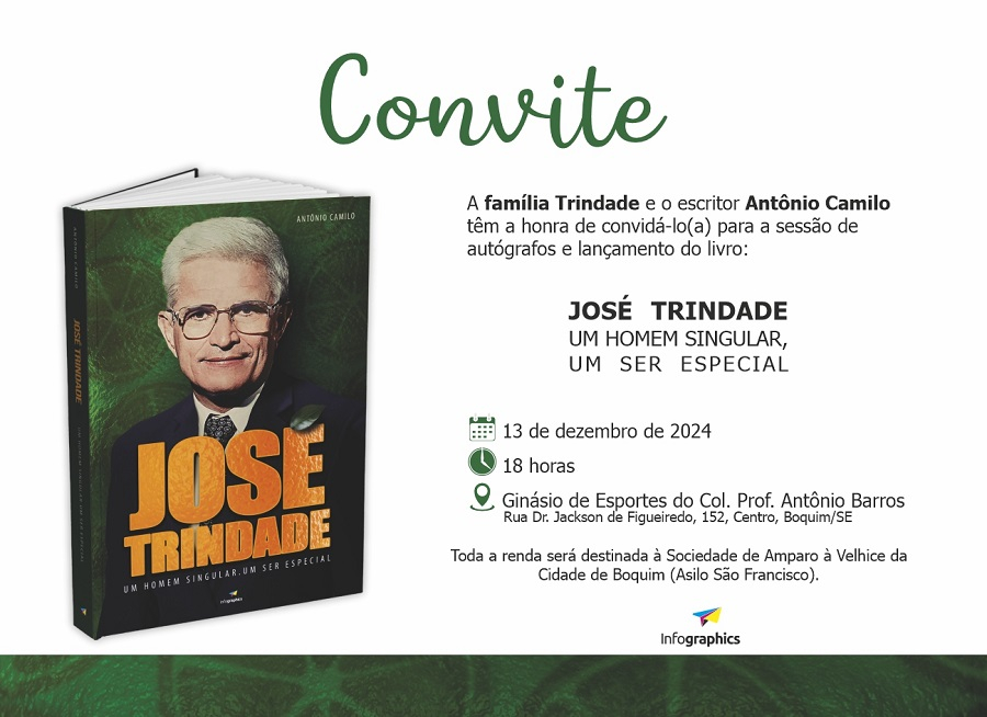 No dia 13 de dezembro, o município de Boquim será sede do lançamento da biografia do engenheiro agrônomo e ex-prefeito José Trindade. Este é o nono livro e sétima obra biográfica do escritor, advogado e analista judiciário do Tribunal de Justiça de Sergipe Antônio Camilo e tem como título “JOSÉ TRINDADE – Um Homem Singular, Um Ser Especial”.