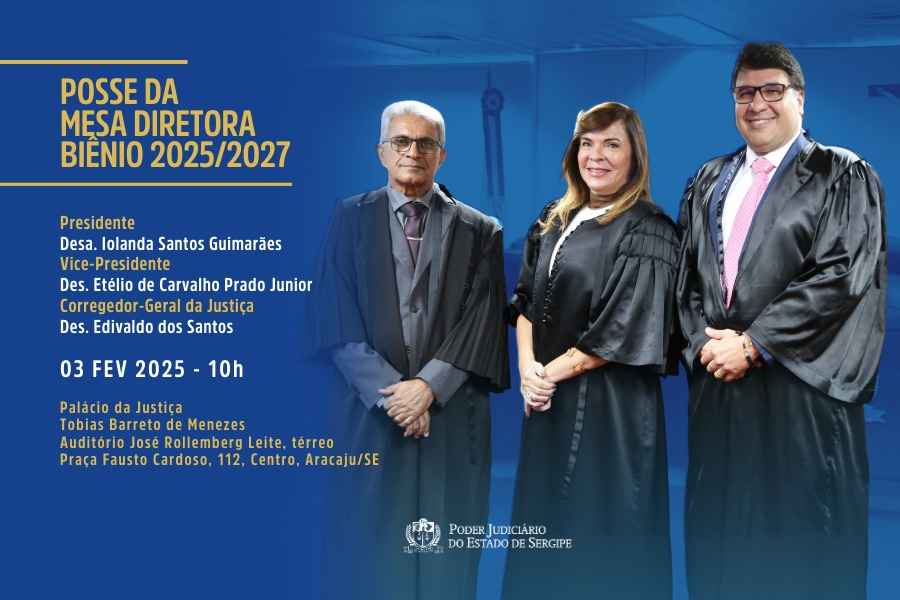 A posse da Mesa Diretora do Tribunal de Justiça de Sergipe (TJSE) para o biênio 2025-2027 acontecerá na próxima segunda-feira, 3 de fevereiro, às 10 horas, no auditório do Palácio da Justiça, localizado à praça Fausto Cardoso, Centro de Aracaju. A Mesa é formada pela desembargadora Iolanda Guimarães, no cargo de Presidente; e desembargadores Etélio de Carvalho Prado Júnior, vice-presidente, e Edivaldo dos Santos, corregedor-geral da Justiça.