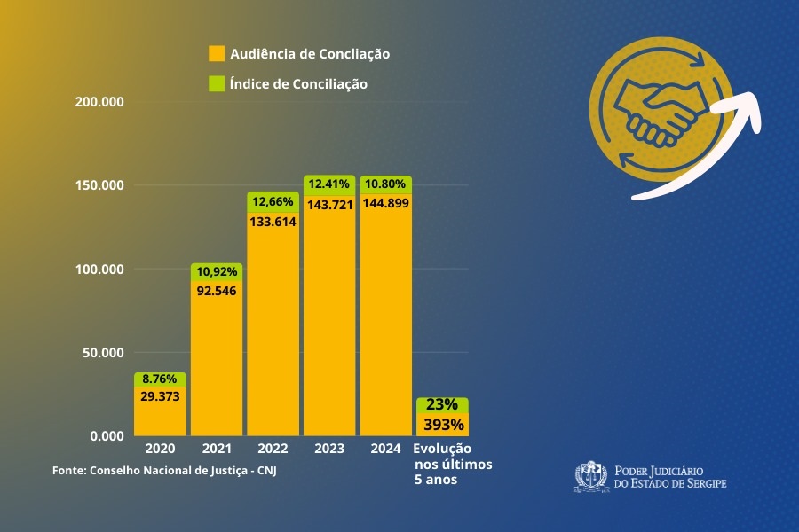 De 2020 a 2024, o Tribunal de Justiça de Sergipe (TJSE) registrou um crescimento de 393% na quantidade de audiências de conciliação. O índice de conciliação também teve um crescimento de 23% no mesmo período. Um dos motivos desse incremento foi a ampliação dos Centros Judiciários de Solução de Conflitos e Cidadania (Cejuscs), que atualmente totalizam 27 espalhados pelo Estado, mais dois temáticos, o de Saúde e o da Pessoa Idosa.