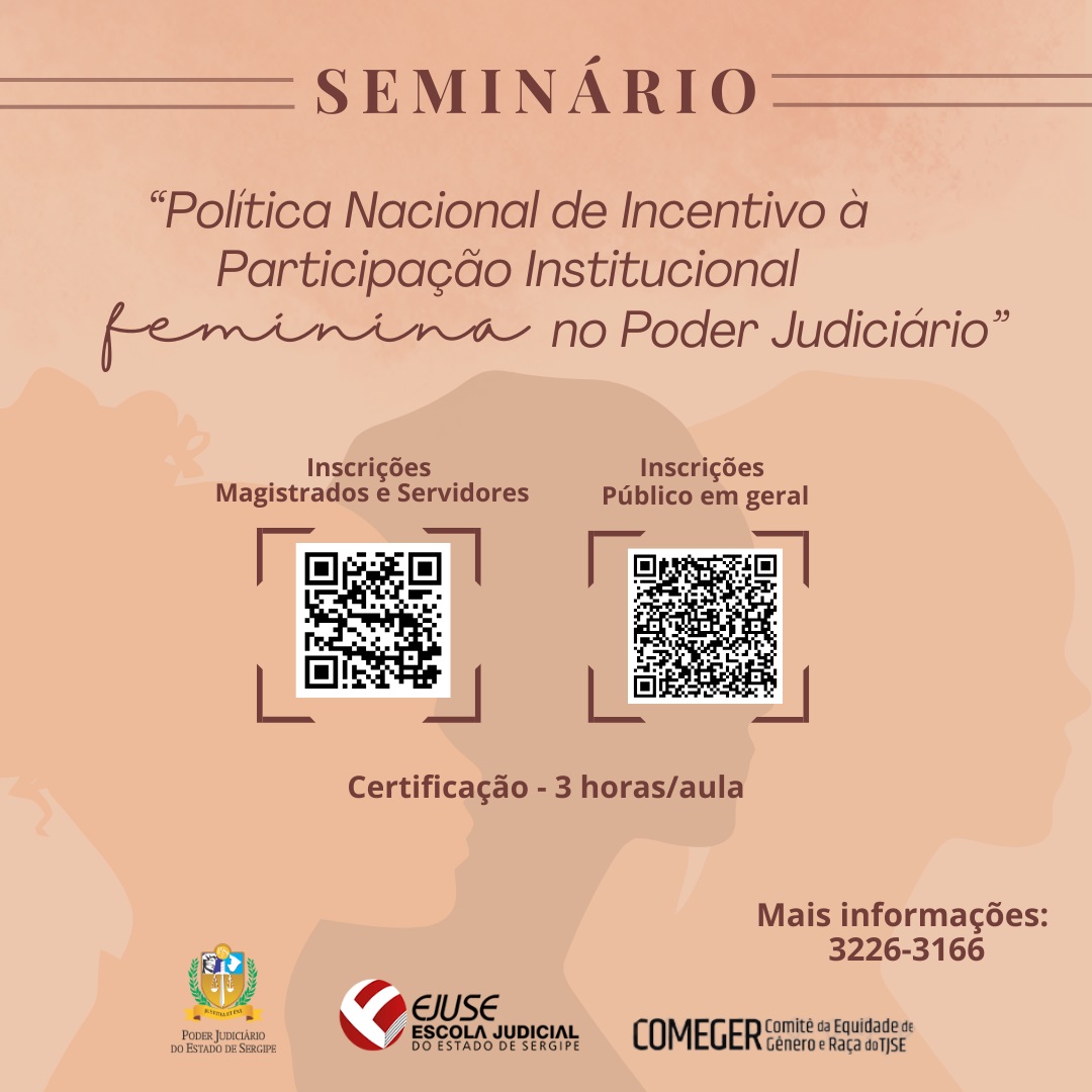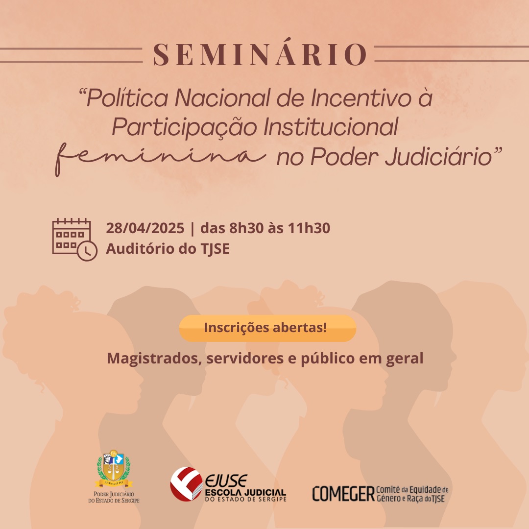 O Tribunal de Justiça de Sergipe (TJSE), numa parceria entre a Escola Judicial de Sergipe (Ejuse) e o Comitê da Equidade de Gênero e Raça (Comeger/TJSE), abre inscrições para o seminário ‘Política Nacional de Incentivo à Participação Institucional Feminina no Poder Judiciário’. O evento será realizado presencialmente no dia 28 de abril, a partir das 8h30, no TJSE, centro de Aracaju.