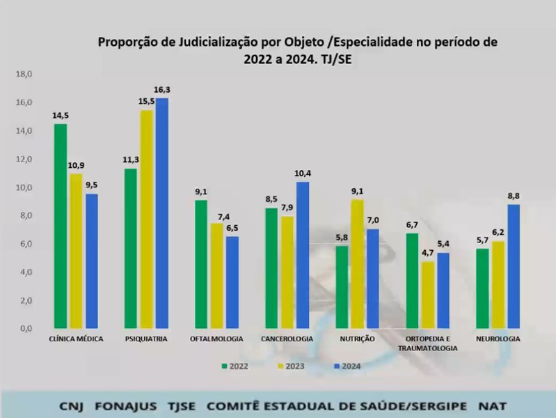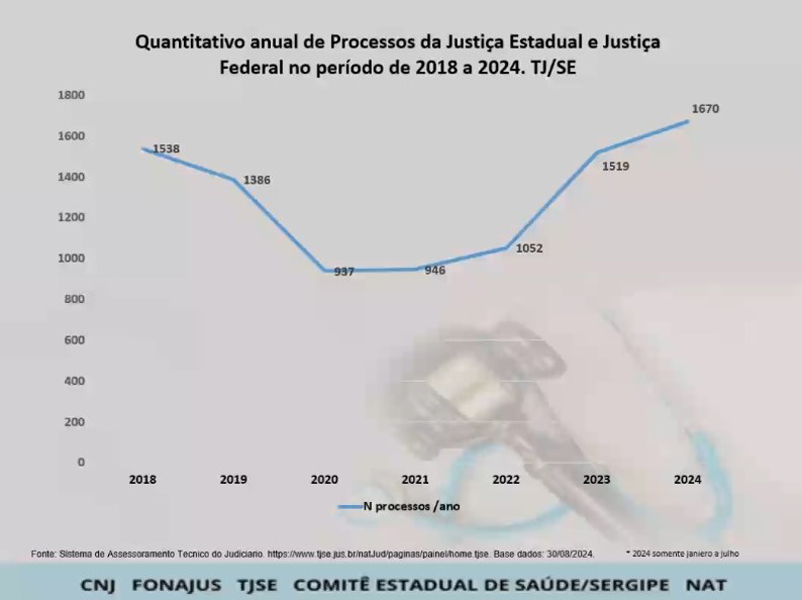 Vários dados foram apresentados. Em 2024, Sergipe registrou 1.670 processos relacionados a demandas de saúde. Entre os tipos de pleitos, esteve no topo da lista os pedidos de medicamentos, seguido de procedimentos clínicos, cirúrgicos, insumos e exames. “O que está acontecendo hoje com o sistema público de saúde nacional? A demanda tem sido maior que a oferta. Existe uma desarticulação entre Estados, Municípios e União, que não conseguem atender essa demanda”, analisou Conceição Mendonça.