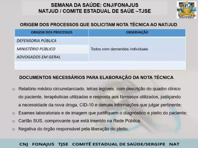 A palestra ‘Atuação do NatJud/SE nos processos judiciais: fluxos assistenciais/administrativos’ foi ministrada pela enfermeira Maria da Conceição Mendonça, que é coordenadora do NatJud em Sergipe. Ela falou sobre a origem dos processos que solicitam nota técnica do NatJud, que vêm da Defensoria Pública, Ministério Público e advocacia; e sobre os documentos necessários para elaboração da nota técnica, como relatório médico, exames laboratoriais, cartão do SUS e negativa do órgão responsável pela liberação do pleito.