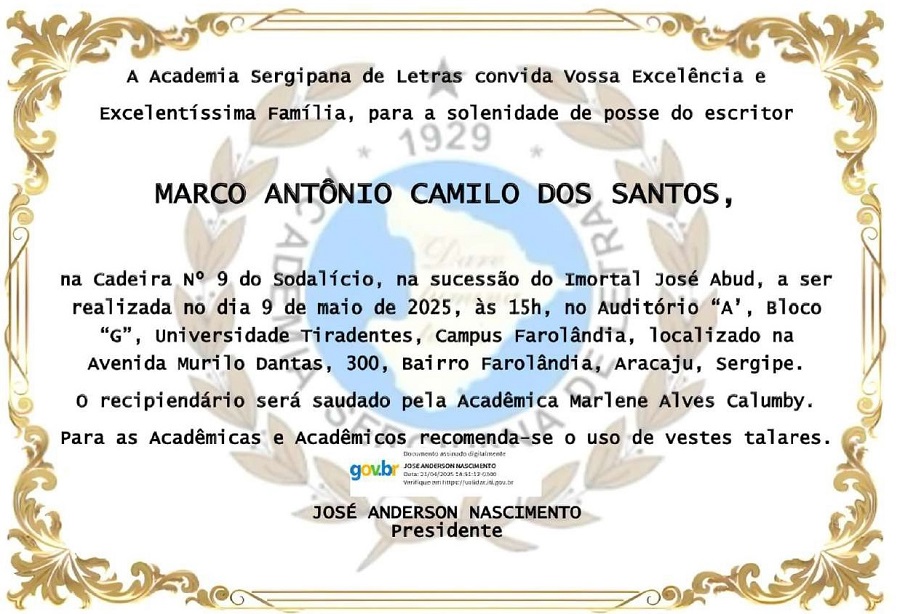 O servidor do Tribunal de Justiça de Sergipe (TJSE), Marco Antônio Camilo dos Santos, tomará posse na Academia Sergipana de Letras (ASL), na sexta-feira, 09/05, às 15 horas. A solenidade acontecerá na Universidade Tiradentes, no auditório A, bloco G, na Farolândia. Camilo, autor de diversos livros e biografias, ocupará a cadeira de número 9, sucedendo o imortal José Abud.