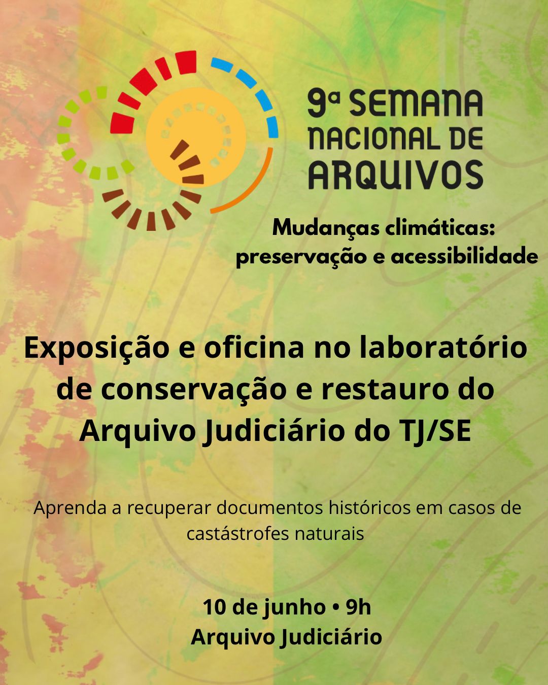Em celebração à 9° Semana Nacional dos Arquivos, o Arquivo Judiciário de Sergipe abre inscrições para uma oficina sobre métodos e técnicas de higienização e conservação de documentos. A oficina será realizada no dia 10 de junho, a partir das 9 horas, no Arquivo, localizado à rua Conselheiro Carlos Sampaio, s/n, bairro Capucho. As vagas são limitadas e as inscrições podem ser feitas, de forma gratuita, pelo e-mail Este endereço de email está sendo protegido de spambots. Você precisa do JavaScript ativado para vê-lo..