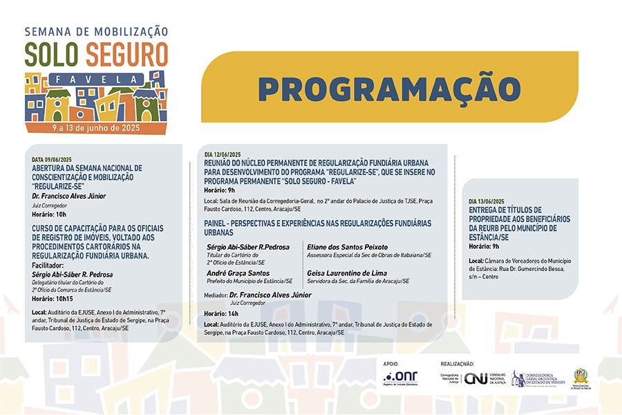 O Tribunal de Justiça de Sergipe (TJSE), por meio da Corregedoria-Geral da Justiça (CGJ/SE), realizará entre os dias 9 e 13/06, a 2ª Semana Nacional de Regularização Fundiária Urbana. A ação integra o projeto Solo Seguro Favela do Conselho Nacional Nacional de Justiça (CNJ) e em Sergipe é denominado ReguLARize-se.