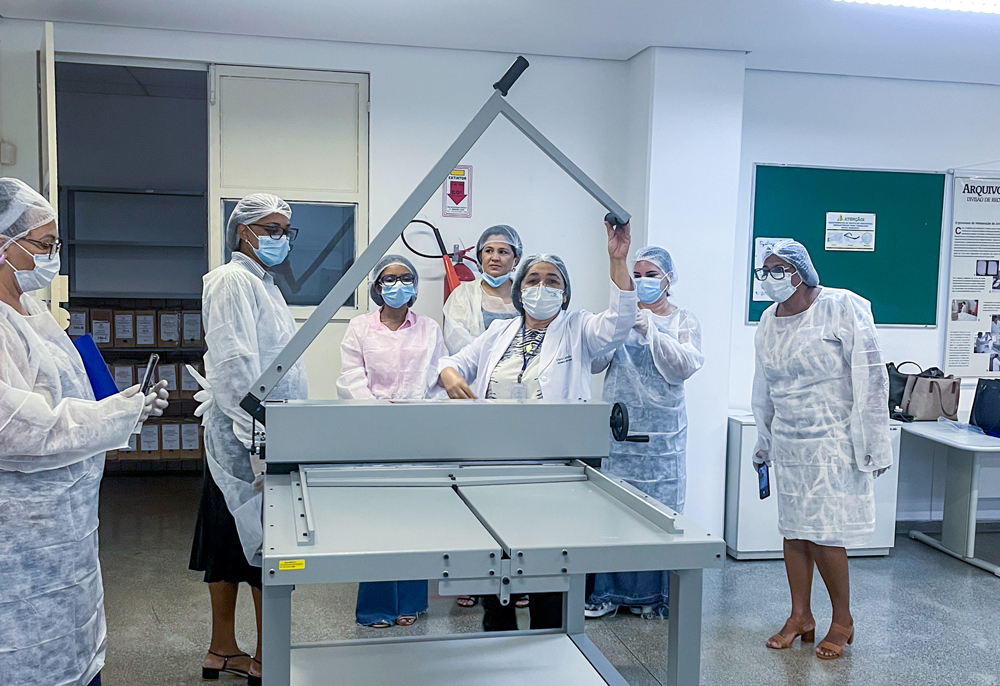 Durante a capacitação, foi demonstrado todo o procedimento que deve ser realizado com o documento em caso de sinistro, como desinfestação, higienização, mapeamento, intercalação, planificação e acondicionamento. Os participantes puderam realizar todo o procedimento prático nas máquinas do laboratório do Arquivo Judiciário, como a máquina higienizadora, guilhotina, máquina obturadora de papel e prensa.