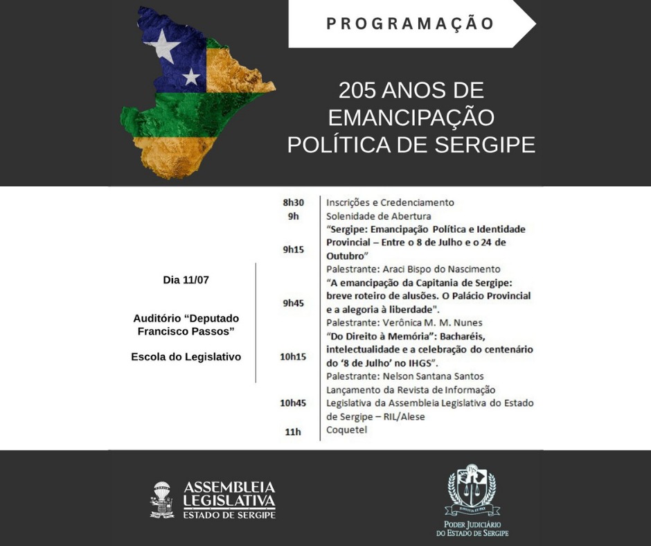 "205 anos de Emancipação Política de Sergipe" é tema do seminário que será realizado pela Assembleia Legislativa de Sergipe, em parceria com o Tribunal de Justiça de Sergipe. O evento ocorrerá na sexta-feira, dia 11 de julho, às 9h, no auditório Deputado Francisco Passos, na Escola do Legislativo.