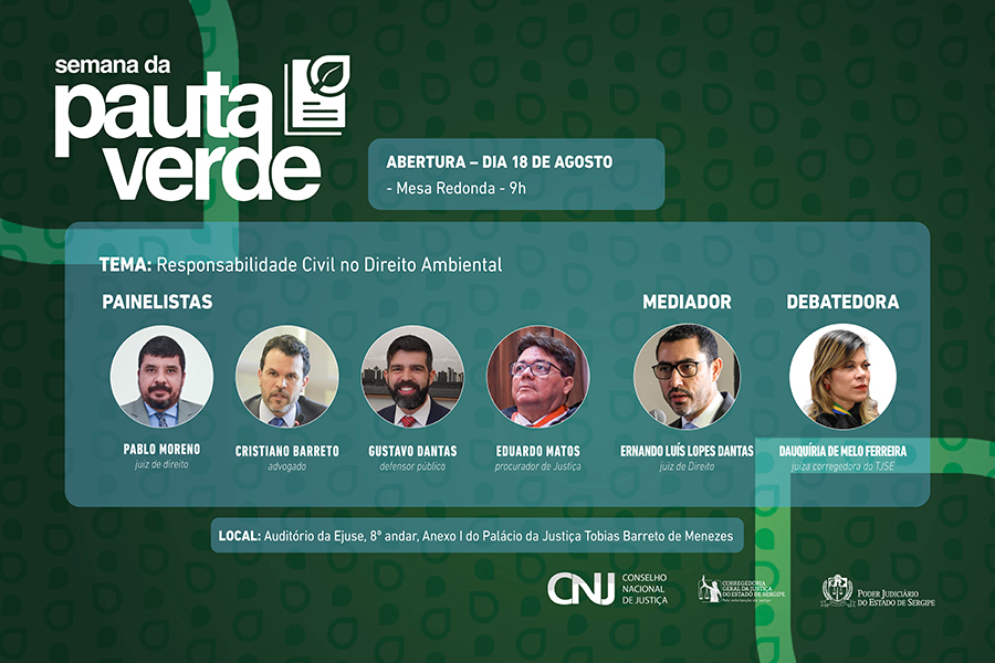 O Tribunal de Justiça de Sergipe (TJSE) realizará entre os dias 18 e 22 de agosto a Semana da Pauta Verde. A ação coordenada acontece em todo o território nacional como parte das ações estratégicas do Fórum Ambiental do Poder Judiciário, organizado pelo Conselho Nacional de Justiça (CNJ) em parceria com os grupos do Meio Ambiente dos Tribunais de Justiça, Tribunais Regionais Federais e conta com o apoio da Procuradoria-Geral Federal.