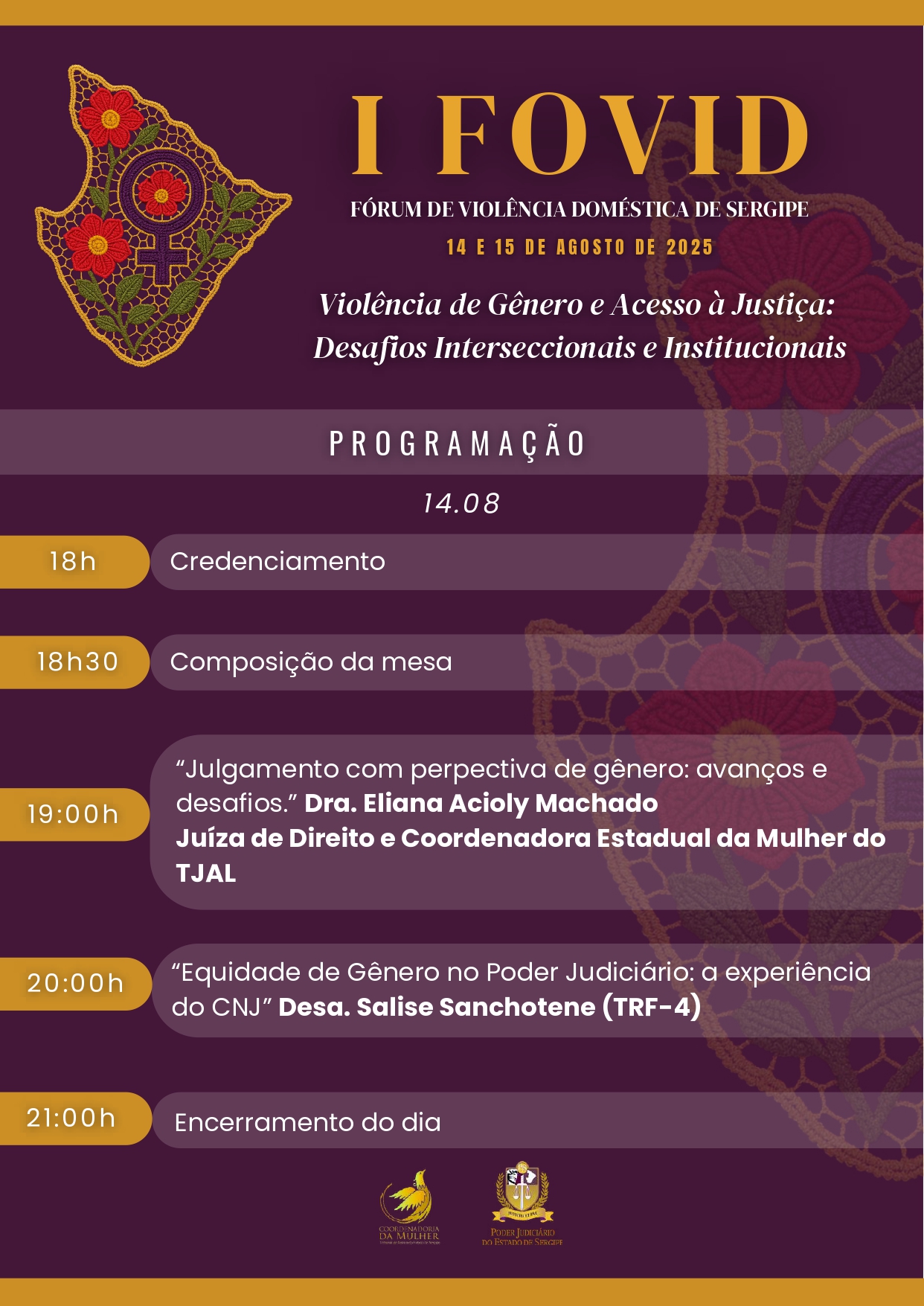 A Coordenadoria da Mulher do Tribunal de Justiça de Sergipe (TJSE) vai realizar, nos dias 14 e 15 de agosto, o I Fórum Sergipano de Violência Doméstica (Fovid). O objetivo é fomentar o debate interdisciplinar e o alinhamento das práticas judiciais ao que preconizam os tratados internacionais de direitos humanos das mulheres e a legislação vigente, com destaque para a Lei Maria da Penha e o protocolo de julgamento com perspectiva de gênero.