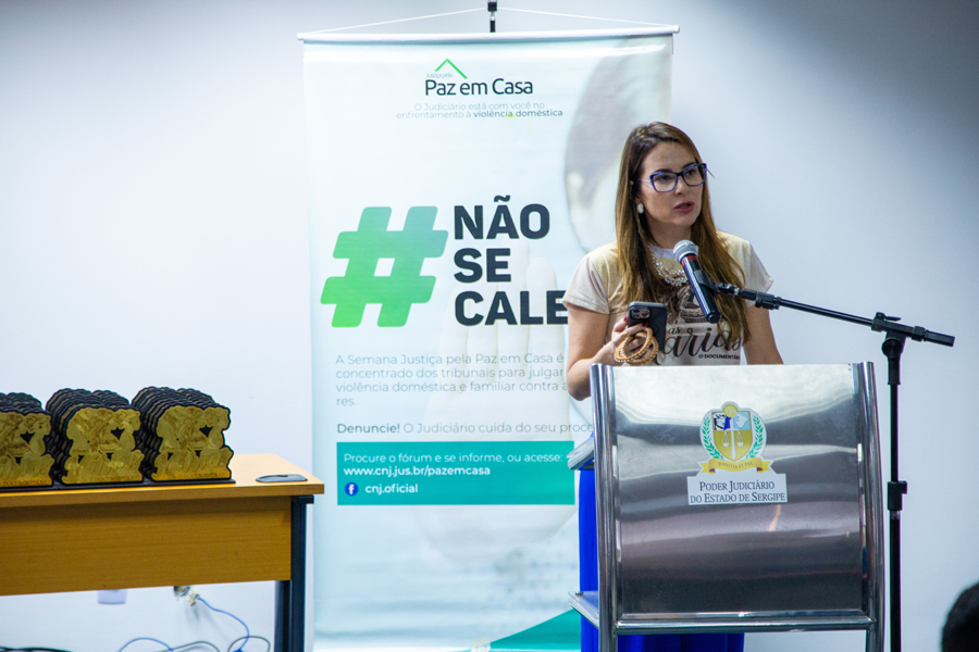 A presidente do Tribunal de Justiça de Sergipe (TJSE), desembargadora Iolanda Guimarães, fez a abertura do evento e viu o documentário. “Mais uma vez reafirmamos nosso compromisso com a proteção das mulheres e o combate firme à violência doméstica e familiar. A cada processo agilizado, a cada medida protetiva concedida com rapidez, a cada vítima ouvida com respeito é uma vida preservada e um passo em direção à paz”, destacou a presidente.