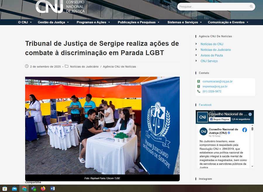 O Tribunal de Justiça de Sergipe (TJSE) ganhou destaque nacional ao ter suas ações de combate à discriminação divulgadas pelo Conselho Nacional de Justiça (CNJ). O Portal CNJ noticiou a participação da Justiça sergipana na Parada LGBT+ de Aracaju, realizada no último domingo, ressaltando o compromisso institucional com a promoção da igualdade e o respeito à diversidade.