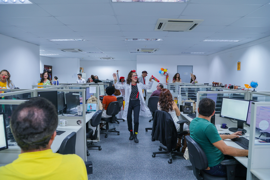 A manhã desta terça-feira, dia 23/09, os servidores do Fórum Gumersindo Bessa iniciaram o dia com alegria. Os Palhaços de Propósito estiveram na Central de Processamento Eletrônico (CPE) para proporcionar acolhimento e descontração no ambiente laboral, reforçando a importância da vida e do cuidado com a saúde mental. A ação intitulada Oficinas da Alegria foi realizada pelo Centro Médico do TJSE.
