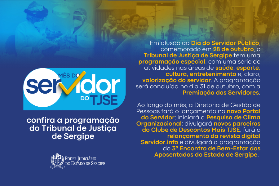 Em alusão ao Dia do Servidor Público, comemorado em 28 de outubro, o Tribunal de Justiça de Sergipe tem uma programação especial, com uma série de atividades nas áreas de saúde, esporte, cultura, entretenimento e, claro, valorização do servidor. A programação será concluída no dia 31 de outubro, com a Premiação dos Servidores.