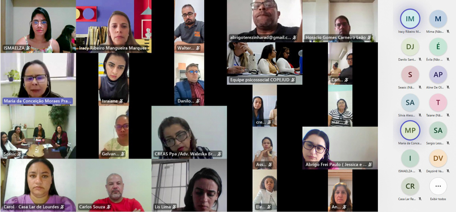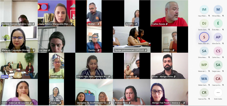 Além de integrantes da CIJ e da Seasic, a reunião contou com a participação de magistradas e magistrados, equipes técnicas de Serviço Social e Psicologia do Tribunal de Justiça, representantes dos Centros de Referência Especializados de Assistência Social (Creas) e profissionais do Serviço de Acolhimento Institucional.
