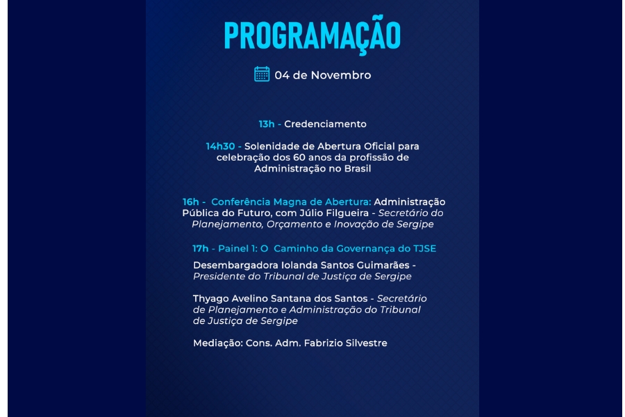 Já o secretário de Planejamento e Administração do TJSE, Thyago Avelino, apresentará o modelo de planejamento e de governança alicerçados em diretrizes estratégicas que valorizam a transparência, a sustentabilidade e o uso inteligente de dados como instrumentos de aprimoramento contínuo da administração pública.