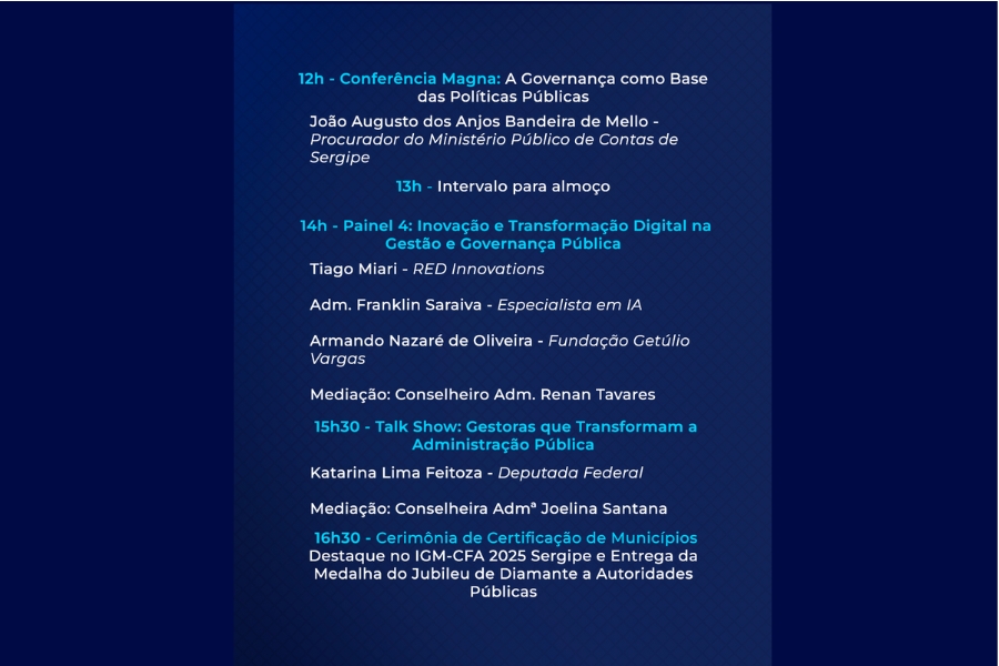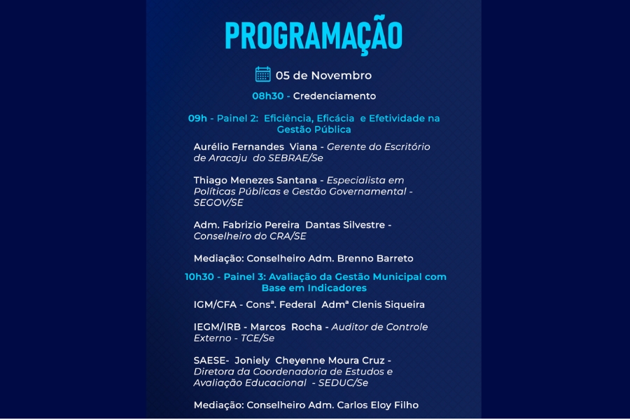 O 1º Seminário de Gestão e Governança Pública contará com, servidores, gestores públicos e especialistas em políticas de inovação e governança, promovendo a troca de experiências, boas práticas de gestão pública em Sergipe, valorizando a posição estratégica do administrador dentro do Poder Executivo, Legislativo e Judiciário. Também serão realizadas conferências, painéis técnicos, talk show, comenda a algumas autoridades e premiação aos municípios que se destacaram no Índice de Governança Municipal (IGM).