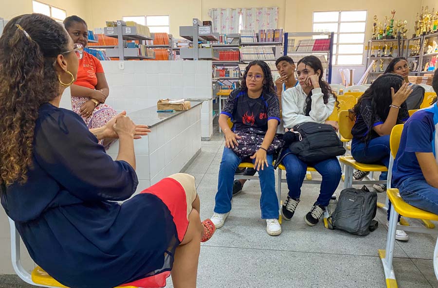 A juíza Carolina Valadares, membro do Comitê Gestor da Equidade de Gênero e Raça (Comeger) do Tribunal de Justiça de Sergipe (TJSE), esteve na Escola Municipal de Ensino Fundamental Presidente Getúlio Vargas, na manhã desta quinta-feira, 23/10. Ela conversou com alunos dos 7o, 8o e 9o anos sobre representatividade, racismo estrutural, preconceito, sistema de cotas, Estatuto da Igualdade Racial e heteroidentificação.
