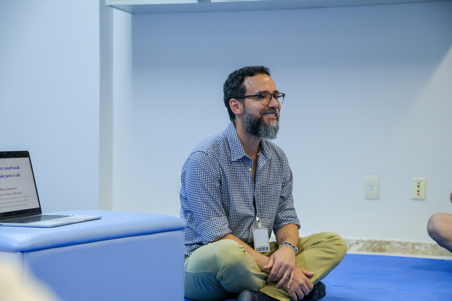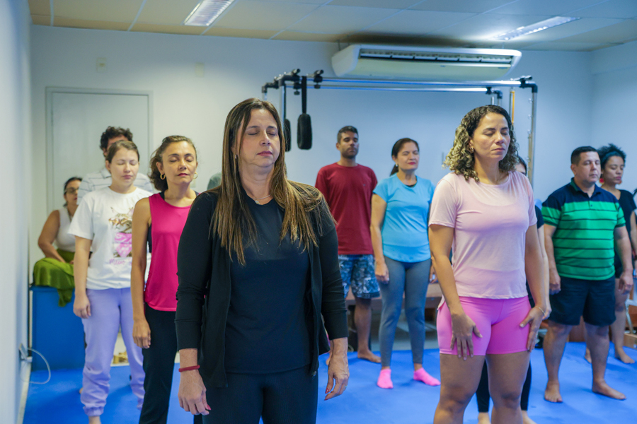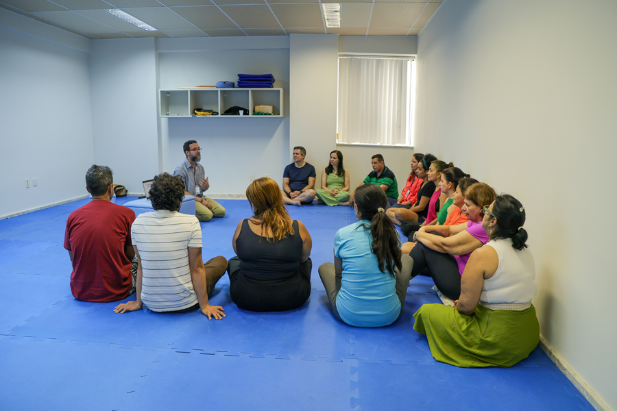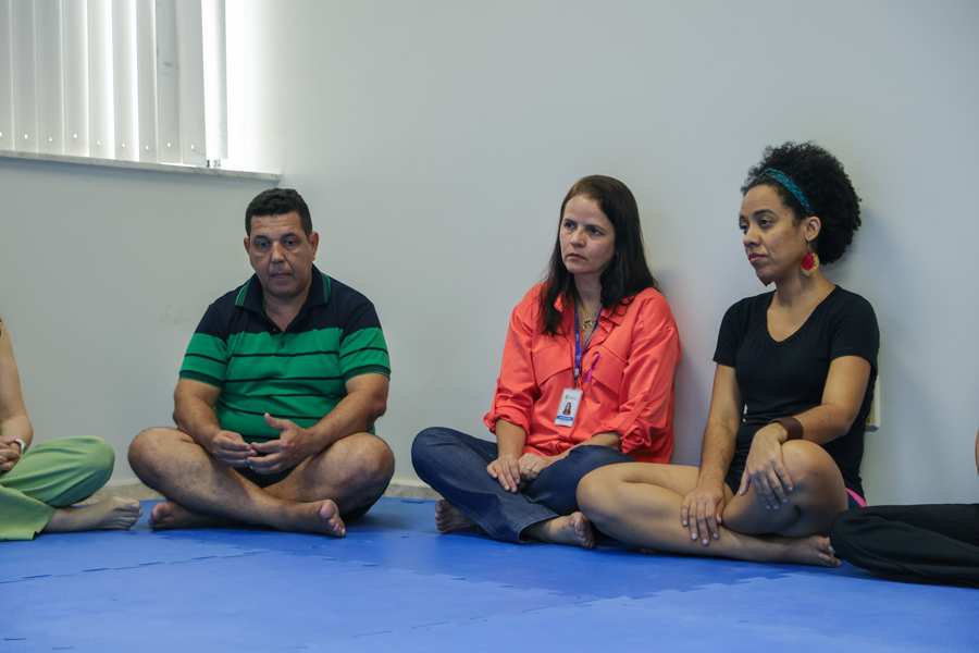 Logo após a yoga, os servidores tiveram outro momento de autocuidado, com o instrutor de meditação e atenção plena. “Estamos sempre pensando em algo além do que estamos fazendo. Existem dados mostrando que isso gera uma infelicidade, um aumento do estresse, da ansiedade, da ruminação mental, causando às vezes até casos de depressão. Quando a gente observa nossas emoções, como está nossa respiração, observa as sensações do corpo, temos uma oportunidade de ter escolhas mais conscientes”, considerou Alisson Nascimento.
