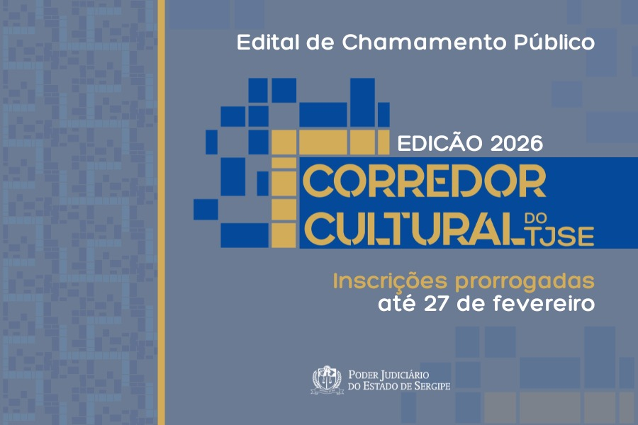 Foi publicada no Diário da Justiça desta quinta-feira, 19/02, o Edital Retificação 02/2026, que prorrogou para 27 de fevereiro o prazo para inscrições na segunda edição do Corredor Cultural do Tribunal de Justiça de Sergipe (TJSE). Podem participar artistas plásticos, pintores, desenhistas e fotógrafos sergipanos; além de magistrados e servidores, requisitados, terceirizados do TJSE que possuam produções artísticas dentro das categorias previstas no edital.