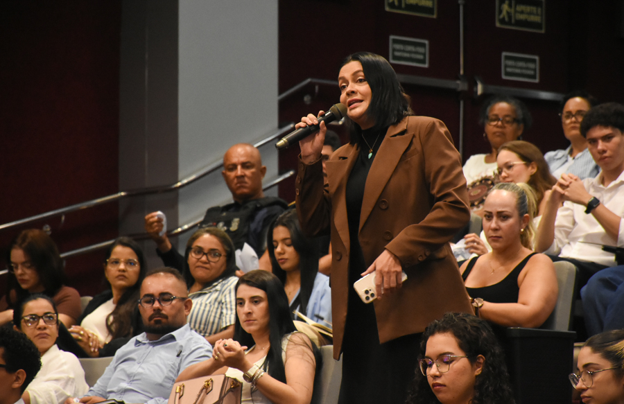 A primeira palestrante foi a advogada, pesquisadora e professora Ana Paula Trento, que apresentou o tema ‘Órfãos do feminicídio: as vítimas invisíveis da violência vicária’, discutindo os reflexos do feminicídio sobre crianças e adolescentes e a necessidade de proteção integral.