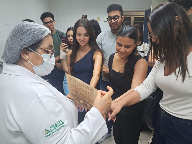 O Arquivo Judiciário recebeu nos dias 25 e 27 de março visitas institucionais de turmas do Curso de Direito da Universidade Tiradentes (Unit), solicitadas pelo Programa de Mentoria da universidade. A ação foi mediada entre o Arquivo e os mentores Bernardo Luz, João Marcelo Santos, João Pedro Amorim e Myrella Silva, com o objetivo de aproximar os estudantes da prática jurídica e da preservação da memória do Judiciário sergipano.