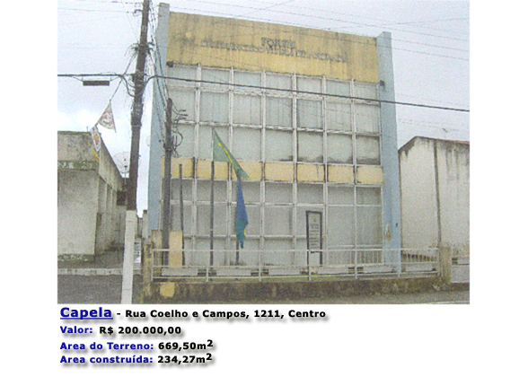 1.1.1 - Lote 1 CAPELA/SE imóvel localizado na Rua Coelho e Campos, nº1211, Centro, tendo as seguintes limitações: Ao norte, com a Rua Sete de Setembro; Ao sul, com a Rua Coelho e Campos; A leste, com as casas nºs 1219 e 1691 de propriedade do Sr. Antônio Correia e casa nº1689 de propriedade da Sra. Maria José Santos de Andrade; A oeste, com a Prefeitura Municipal de Capela. Imóvel matriculado sob o nº9.752, Cartório do 1º Ofício de Registro Geral de imóveis da cidade de Capela, Estado de Sergipe;