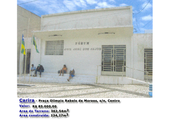 1.1.2 - Lote 2 - CARIRA/SE imóvel localizado na Praça Olímpio Rabelo de Moraes, s/n, Centro, tendo as seguintes limitações: Ao norte, com o terreno do Banco do Nordeste, localizado na Praça Olímpio Rabelo de Menezes, s/n; Ao sul,com o antigo Posto da Telemar, nº98; A leste, com a tradicional Pizzaria da Dete, nº60, de propriedade da Sra. Isabel Alves de Souza Rabelo; A oeste, com a Praça Olímpio Rabelo de Moraes. Imóvel matriculado sob o nº0189, Cartório do 1º Ofício de Registro Geral de imóveis da cidade de Carira, Estado de Sergipe;