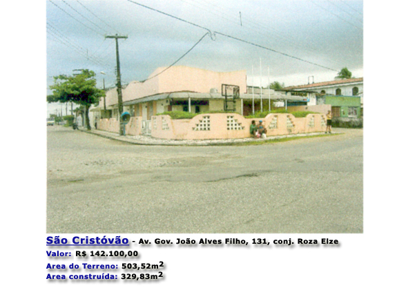 1.1.5 - Lote 6 SÃO CRISTÓVÃO - imóvel localizado na Av. Gov. João Alves Filho nº131, Rosa Elza, tendo as seguintes limitações: Ao norte, com um imóvel residencial de propriedade do Sr. Antônio Ivan do Nascimento; Ao sul, com a Av. Gov. João Alves Filho; A leste, com um prédio onde funciona uma oficina mecânica Mardo, de propriedade do Sr. Mardoqueu; A oeste, com a Rua Alan Silva. Imóvel matriculado sob o nº 1.088, Cartório do 1º Ofício de Registro Geral de Imóveis Rivanda Carmelo da cidade de São Cristóvão, Estado de Sergipe.