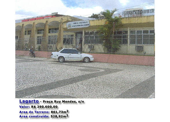 1.1.4 - Lote 4 LAGARTO - imóvel localizado na Praça Ruy Mendes, s/n, tendo as seguintes limitações: Ao norte, com a Loja Carvalho Fonseca; Ao sul,com a Praça Ruy Mendes; A leste, com a Rua Nossa Senhora da Piedade; A Oeste, com um imóvel nº22, localizado na Praça Ruy Mendes, de propriedade do Sr. José Rosalvo. Primeiro Traslado do Imóvel registrado no Livro 170, às fls. 186/187 do Cartório do 1º Ofício da cidade de Lagarto, Estado de Sergipe;