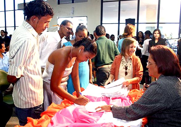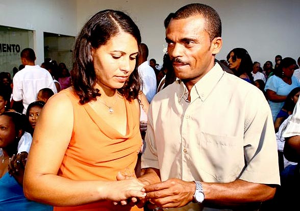 A maioria dos casais já tinha uma união estável. A dona de casa Viviane dos Santos, de 22 anos, e o garçom Wilton dos Santos, de 26, moram juntos há nove anos e têm um filho. A gente tinha vontade de casar, mas era difícil porque o cartório é longe. Aqui foi fácil, demos entrada e tudo se resolveu bem rápido, comentou Viviane. A alegria do casal era tanta, que ao invés do sim, Wilton respondeu com certeza à pergunta da juíza se era de livre e espontânea vontade formalizar a união.