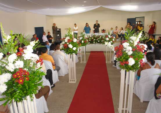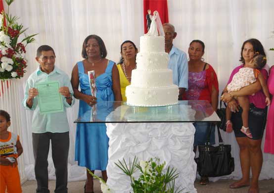 A cerimônia ocorreu no Centro Social, que estava todo ornamentado para o casório. Com direito a marcha nupcial, damas de honra e bolo de casamento, os noivos estavam emocionados com a oficialização da união. A maioria dos casais já vivia em união estável, como é o caso de Maria Margarida Cordeiro e Manoel Floro dos Santos. Com uma convivência de 30 anos, quatro filhos e três netos a ideia de regularizar a situação junto à Justiça foi do marido. Ele disse que já era hora da gente se casar. Ficamos sabendo que haveria aqui uma ação para casar todo mundo e aproveitamos. É um dos momento mais importantes de nossas vidas, a realização de um sonho, disse a esposa.
