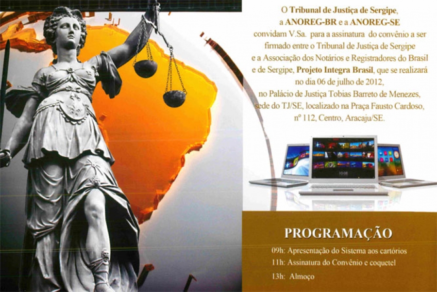 O Tribunal de Justiça de Sergipe (TJSE) e as Associações de Notários e Registradores do Brasil e de Sergipe (ANOREG/BR e ANOREG/SE) realizam, na próxima sexta-feira, 06.07, às 9h, no Palácio da Justiça, cerimônia de assinatura de convênio para implantação do Sistema Integra Brasil. O referido sistema permitirá o intercâmbio de informações entre as serventias extrajudiciais e os órgãos do Poder Judiciário, mediante a utilização da internet e de certificação digital.
