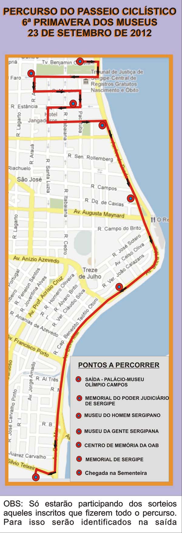 Em Sergipe, o Memorial do Poder Judiciário, Palácio-Museu Olímpio Campos, Museu da Gente Sergipana, Museu do Homem Sergipano, Memorial de Sergipe e a OAB/SE, uniram-se para a realização de um passeio ciclístico, no dia 23 de setembro, às 7h30. O ponto de partida será o Palácio-Museu, na praça Fausto Cardoso, e chegada no Parque da Sementeira, onde acontecerão sorteios de brindes, entre eles, bicicletas e capacetes.