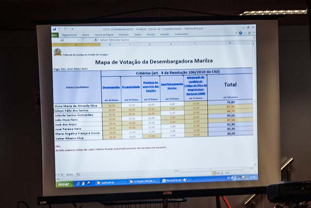 As notas foram veiculadas em dois telões instalados no auditório do Pleno do TJSE. O último a votar foi o Presidente do TJSE. “Todos são dignos, honrados, capazes e intelectualmente preparados para o exercício da Desembargadoria”, elogiou o Presidente, antes de apresentar a nota final. A Juíza Iolanda Guimarães ficou em segundo lugar, com 1.114,20 pontos, e o Juiz Gilson Félix dos Santos em terceiro, 1.108,95 pontos.