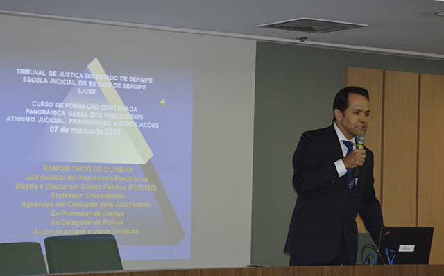 A Escola Judicial de Sergipe (Ejuse), do Tribunal de Justiça de Sergipe, realizou na tarde desta segunda-feira, 07/03, um curso sobre precatórios para magistrados e servidores. O curso foi ministrado pelo doutor em Direito Público e Juiz do Tribunal de Justiça de Minas Gerais Ramon Tácio de Oliveira. Com 11 anos de experiência no setor de precatórios, ele apresentou um panorama nacional sobre o tema e falou sobre a experiência mineira.