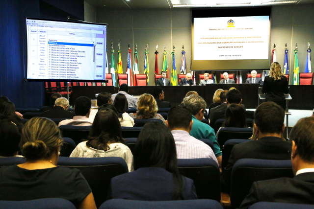 Foi realizada nesta sexta-feira, 10.06, a Sessão Pública de Escolha, Outorga de Delegação e Investidura nas Serventias Extrajudiciais de Notas e de Registro do Estado de Sergipe pelos aprovados no concurso regido pelo Edital nº 01/2014. Os 89 candidatos habilitados puderam escolher as 53 serventias disponibilizadas para este certame.