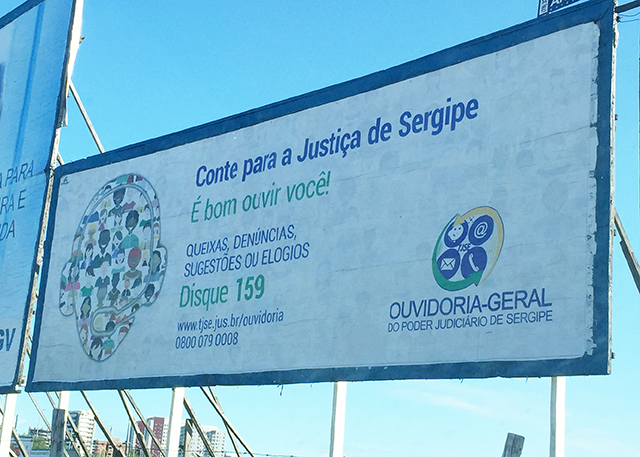 Está estampada em ônibus, outdoors, cartazes e veículos de serviço do Tribunal de Justiça de Sergipe a mais recente campanha da Ouvidoria Geral. Com o slogan ‘Conte para a Justiça de Sergipe. É bom ouvir você!’, a campanha divulga o disque 159, telefone através do qual podem ser feitas denúncias, queixas, sugestões ou elogios relativos ao trabalho do Judiciário. O material gráfico também traz outros canais de comunicação com a Ouvidoria: o site www.tjse.jus.br/ouvidoria e o 0800 079 0008.