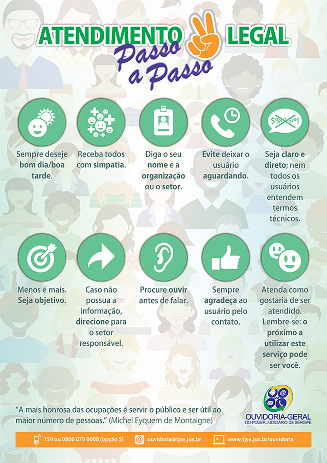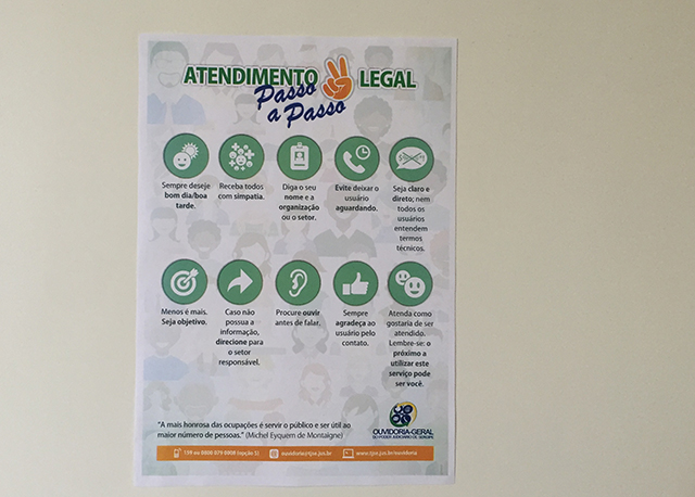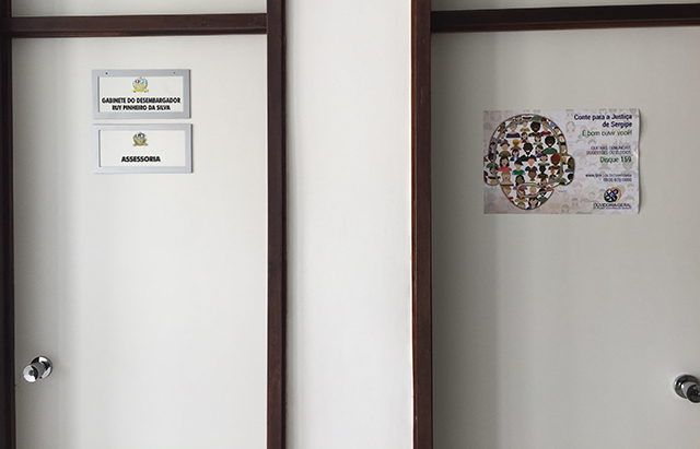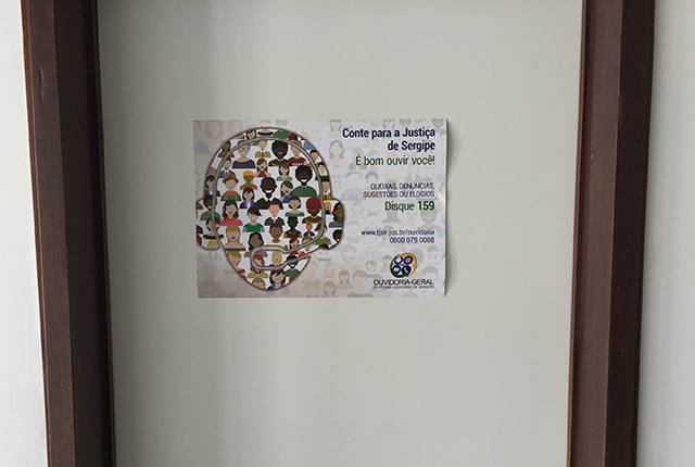 Os cartazes da campanha ‘Conte para a Justiça de Sergipe’ foram espalhados nas portas das Varas e locais de grande circulação por todos os fóruns do Estado. Já o novo cartaz da campanha ‘Atendimento Legal: Passo a Passo’, direcionada aos servidores, foi distribuído no interior das unidades jurisdicionais (cartórios, atendimento, gabinetes). Também foram distribuídos cartazes da Ouvidoria Nacional do Conselho Nacional do Ministério Público.